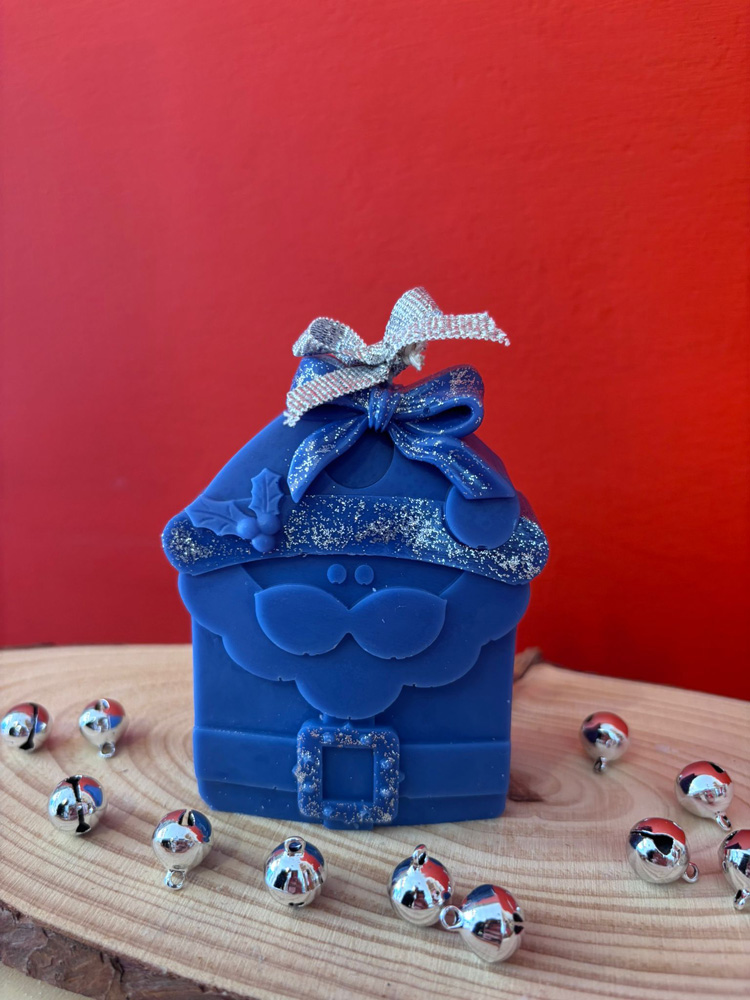 Candela in cera di oliva – Colore blu – Essenza zucca vanigliata – Dettagli con brillantini argento o dipinti in argento a mano.