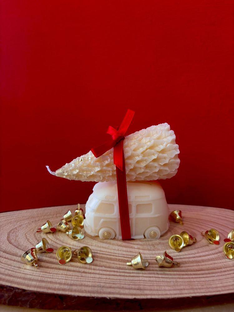 Candela in cera di oliva – Colore bianca – Essenza zucca vanigliata – Dettagli con brillantini argento o dipinti in argento a mano.