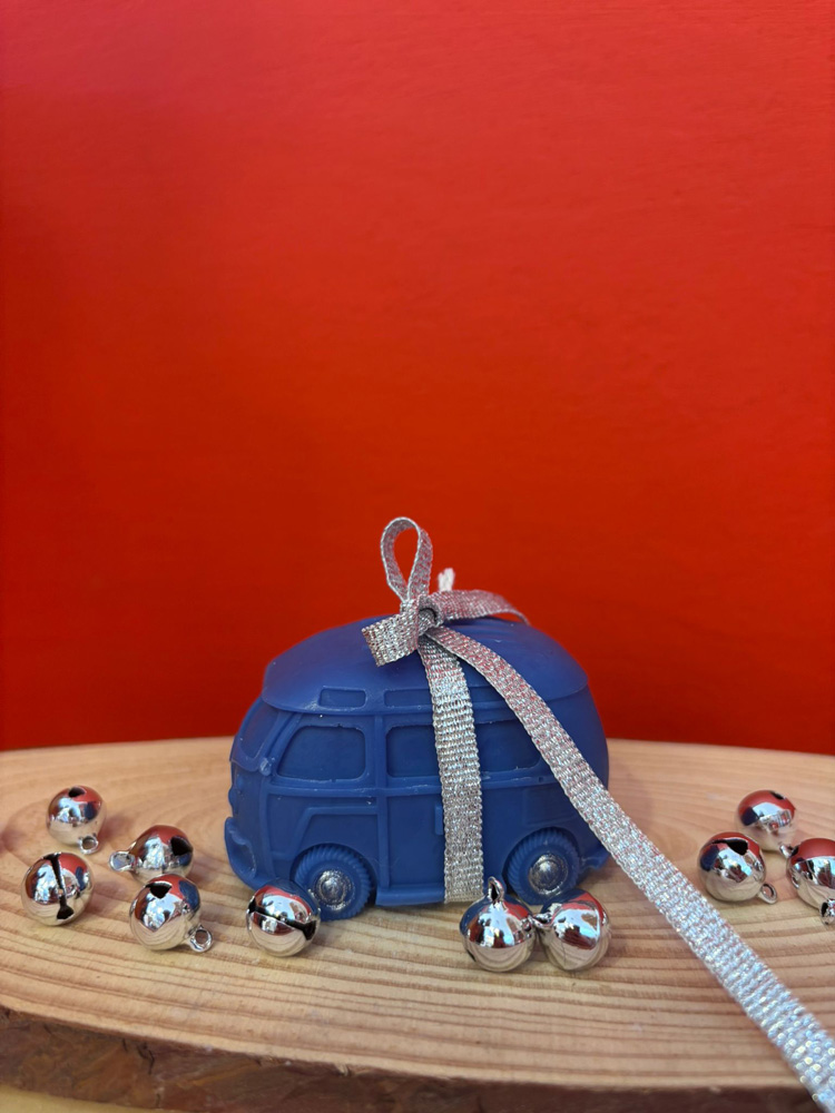 Candela in cera di oliva – Colore blu – Essenza zucca vanigliata – Dettagli con brillantini argento o dipinti in argento a mano.