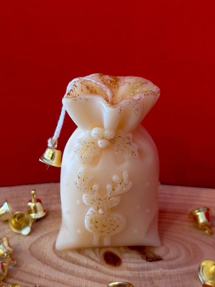 Candela in cera di oliva – Colore bianca – Essenza zucca vanigliata – Dettagli con brillantini argento o dipinti in argento a mano.