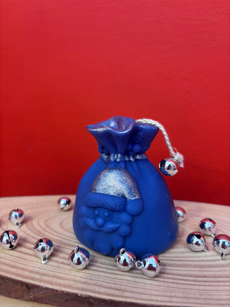 Candela in cera di oliva – Colore blu – Essenza zucca vanigliata – Dettagli con brillantini argento o dipinti in argento a mano.