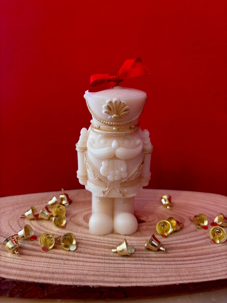 Candela in cera di oliva – Colore bianca – Essenza zucca vanigliata – Dettagli con brillantini argento o dipinti in argento a mano.
